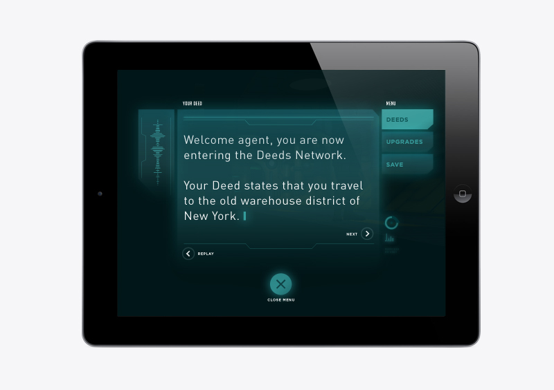 Iconography and interfaces for a side-scrolling sci-fi game, DEEDS: The Secret Network, designed for iPad and Console. In DEEDS, you play a secret agent with a powerful range of gadgets and armor who must complete his assigned missions from the Network, no matter the danger–or the cost.